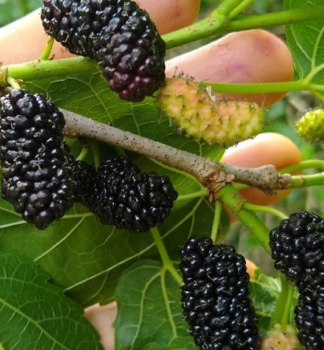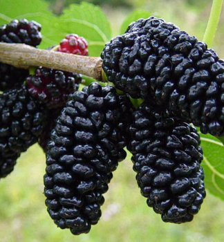 Moruša naštepená na kmienku so zdravými a chutnými čiernymi plodmi.