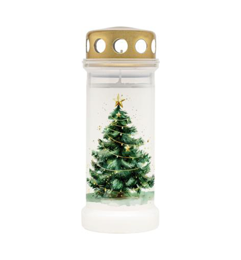 Charakteristika: Parafínová sviečka Bolsius je kvalitná náplň do kahanca s motívom stromčeka vhodná na pietne miesta, cintoríny alebo osobnú spomienku. Jeho dizajn zdobí jemný vianočný stromček, ktorý dodáva dekoratívny a sviatočný vzhľad. Náplň je vyrobená z kvalitného rafinovaného parafínu, ktorý zabezpečuje čisté a stabilné horenie. Plastové puzdro so zlatým odvetrávaným krytom chráni plameň pred vetrom a dažďom. Doba horenia – 70 hodín. Rozmery: výška 173 mm × priemer 67 mm.