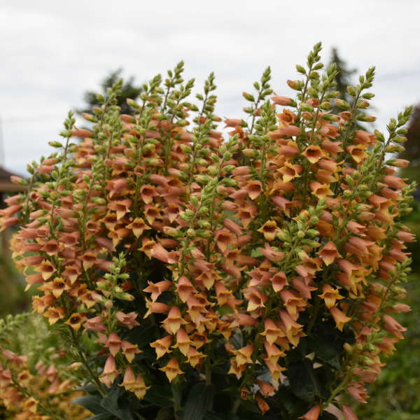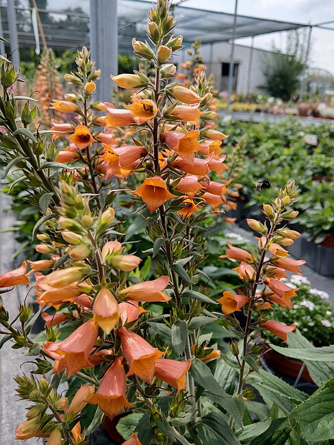 Vyššia trvalka so zvončekovitými kvetmi v oranžových tónoch.