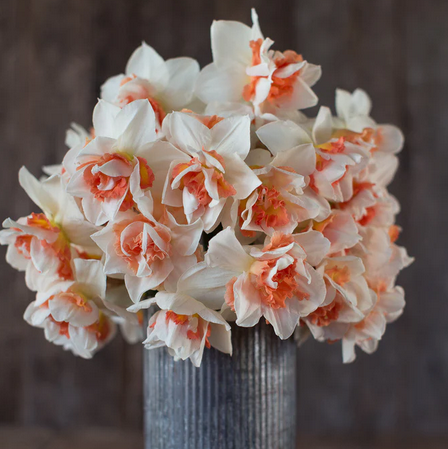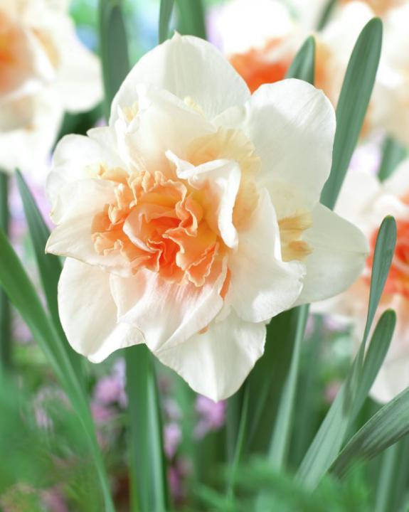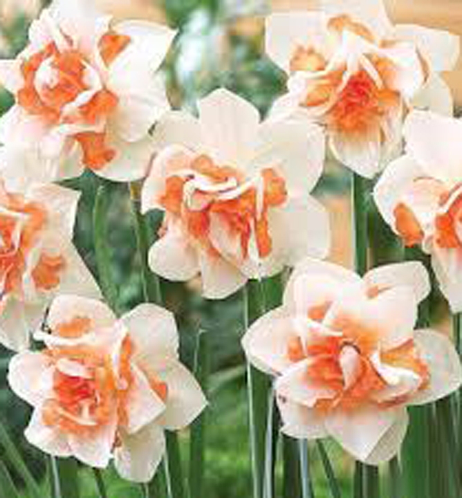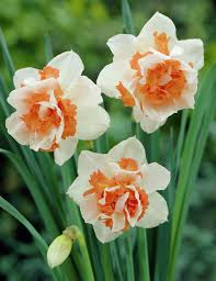 Veľkokvetý, plnokvetý narcis s krémovobielymi kvetmi a oranžovým stredom.
