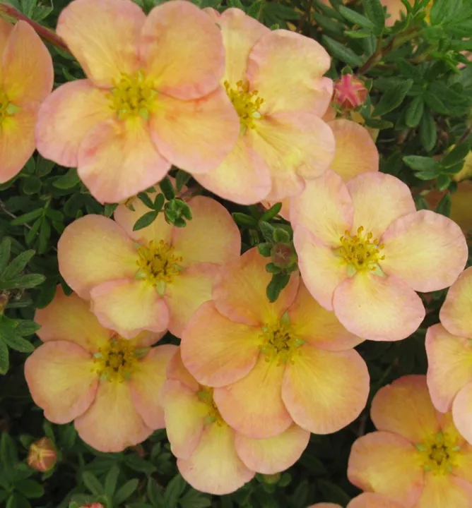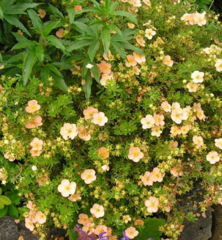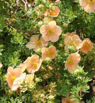Nízky, bohato kvitnúci nátržník s malými kvetmi oranžovo lososovej farby.