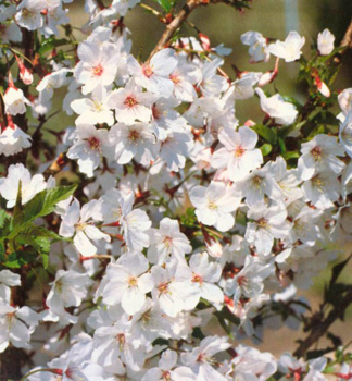 Bohato kvitnúci nízky strom s veľkým množstvom bielych kvetov.