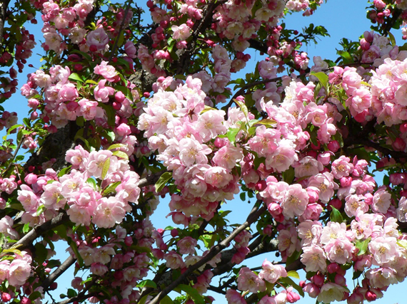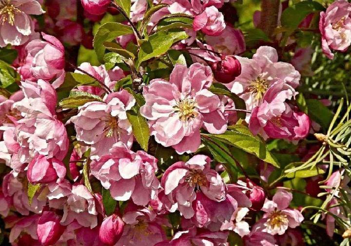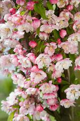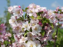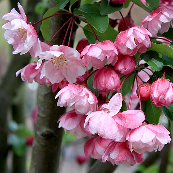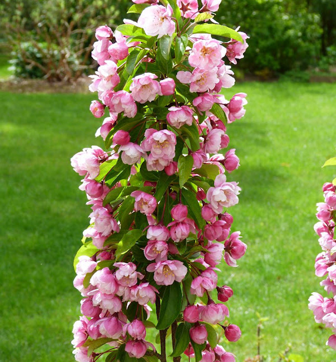 Jedinečná okrasná jabloň stĺpovitého tvaru a očarujúcimi poloplnými ružovými kvetmi.