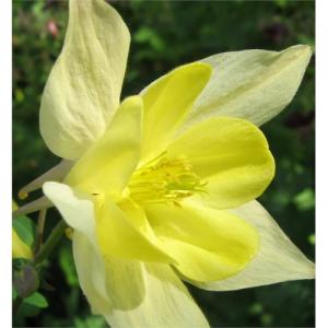Veľkokvetý nízky orlíček s krémovo žltými kvetmi so zlato žltým stredom.