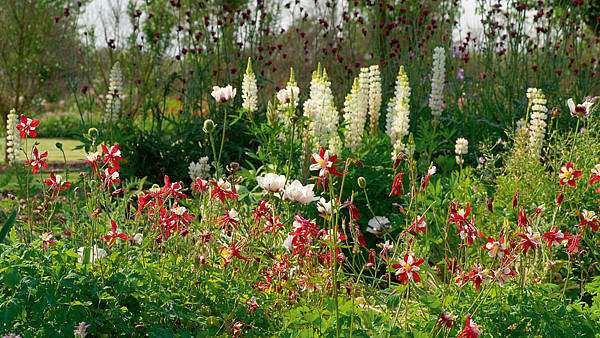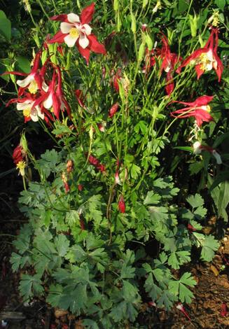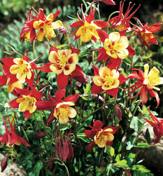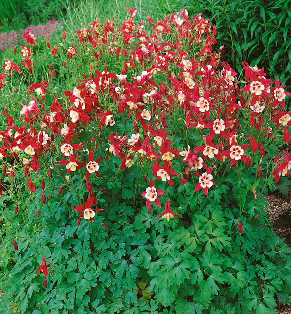 Nádherný, bohato kvitnúci orlíček kontrastnej červeno maslovej farby.