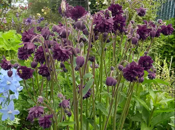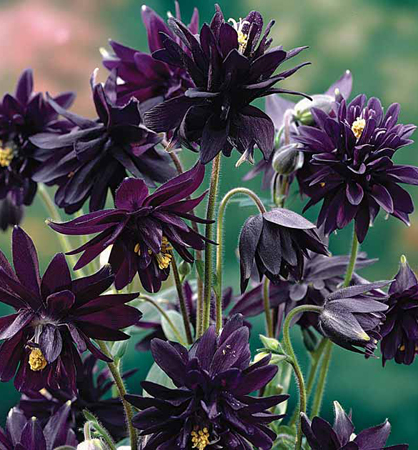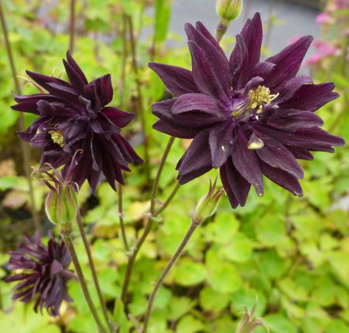 Okúzľujúci plnokvetý orlíček s exotickými fialovočiernymi kvetmi.