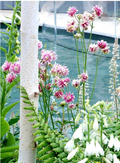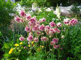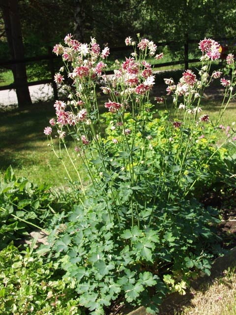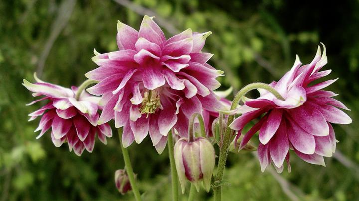 Dvojfarebný plnokvetý orlíček s ružovo bielymi kvetmi netradičného vzhľadu.