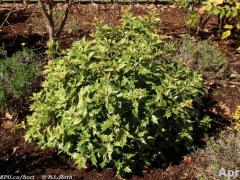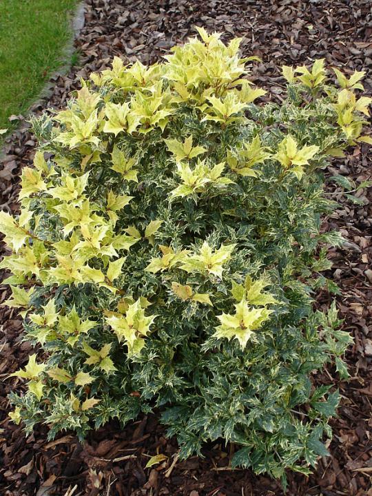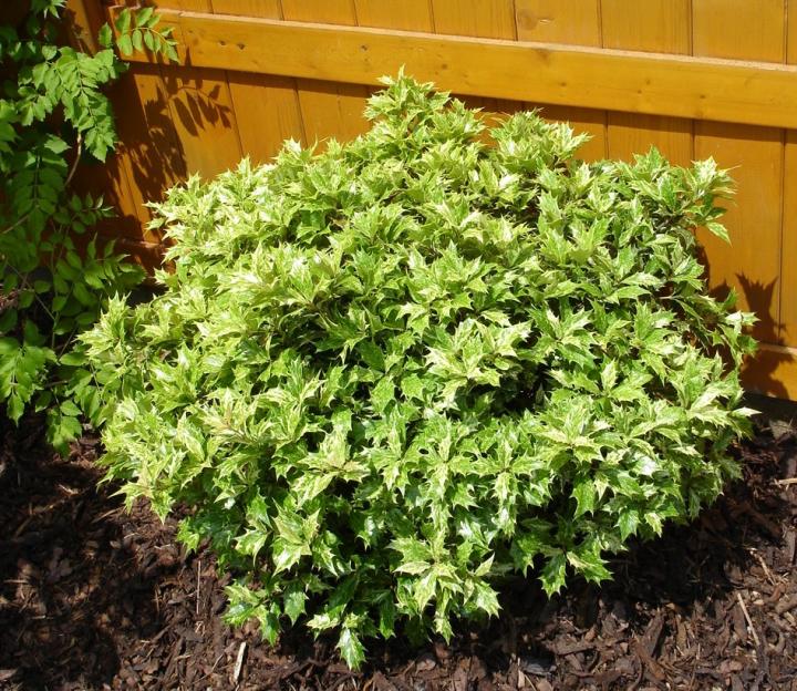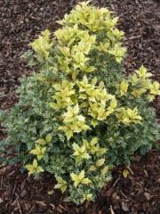Vždyzelený kompaktný ker s dvojfarebnými listami a bielymi kvetmi.