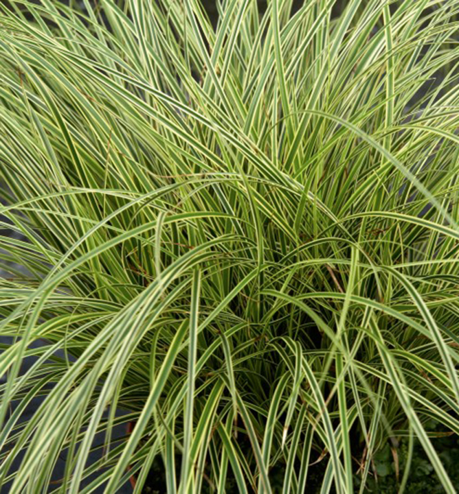 Nízka ostrica s mierne prevísajúcimi zelenými listami s krémovým okrajom.