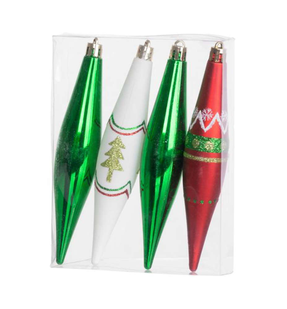 Charakteristika: Súprava ozdôb na stromček slúži na slávnostné ozdobenie vianočného stromčeka. Pozostáva zo 4 ks vianočných ozdôb s rozmerom 3x15 cm. Farba ozdôb je červeno - zelená s dekoráciou. Sú vyrobené z plastu.