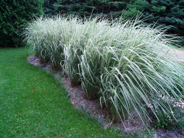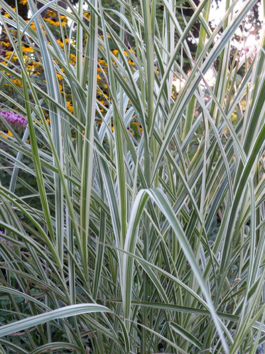 Nižšia okrasná tráva s kratšími striebristozelenými listami so žltým stredom.