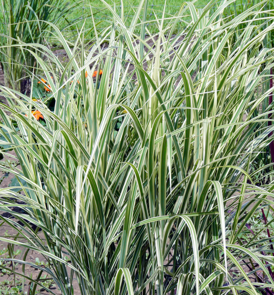 Vždyzelená vlhkomilná tráva so zelenými listami a smotanovobielymi pruhmi.