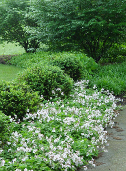 Bohato kvitnúca kobercovitá odroda s hviezdicovitými kvetmi snehobielej farby.