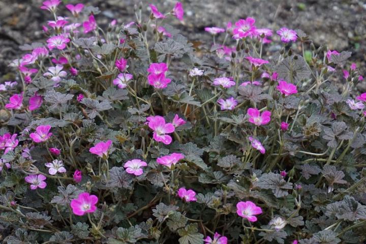 Nenáročná skalnička so sivo zelenými listami a ružovými kvetmi.
