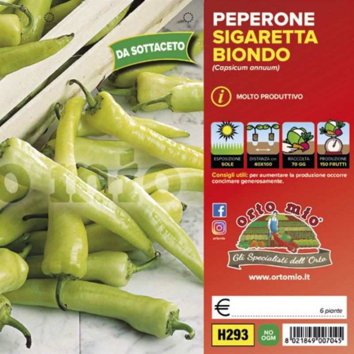 Charakteristika: Paprika ´SIGARETTA BIONDO´ je tradičná odroda, ktorá sa vyznačuje veľmi úzkymi, pretiahnutými plodmi a vysokou úrodnosťou. Ide o skorú až stredne skorú odrodu, ktorá je dobre prispôsobená pestovaniu na otvorenom poli aj v chránených podmienkach. Plody sú dlhé, úzke a mierne zahnuté, dosahujú približne 12–16 cm. V technickej zrelosti majú svetlozelenú až bledožltú farbu, pričom pri plnej zrelosti postupne dozrievajú do jasne červenej farby. Sú charakteristické jemnou sladkastou chuťou a len veľmi slabou pikantnosťou.