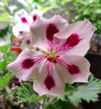 Aromatická letná trvalka s veľkými kvetmi ružovej farby so žltým hrdlom.