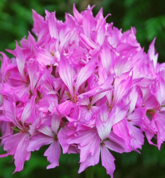 Aromatická letná trvalka s veľkými kvetmi ružovej farby so žltým hrdlom.