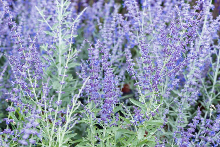 Očarujúca bohato kvitnúca zanoväť s purpurovými kvetmi v tvare motýlich krídel.