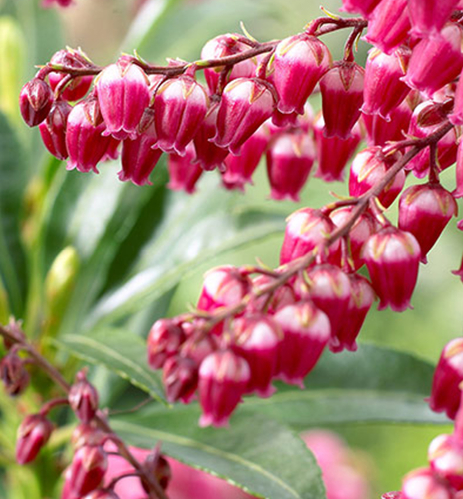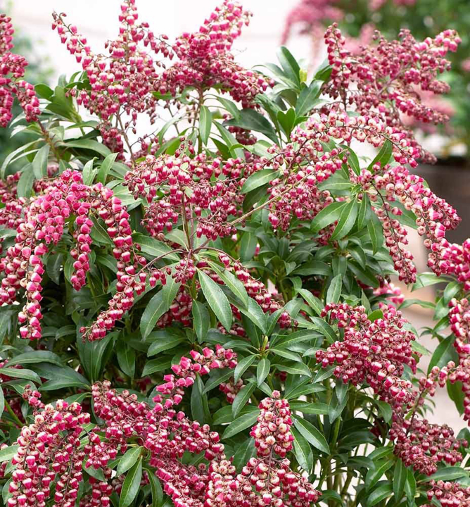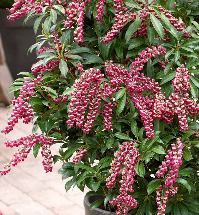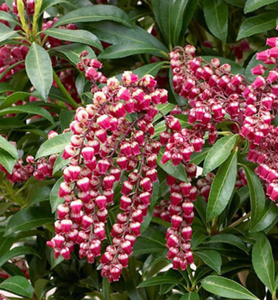 Kompaktný stálozelený pieris s purpurovými zvončekovitými kvetmi.