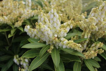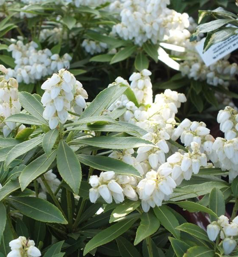 Jarný vždyzelený ker s výraznými kvetmi a lesklými zelenými listami.