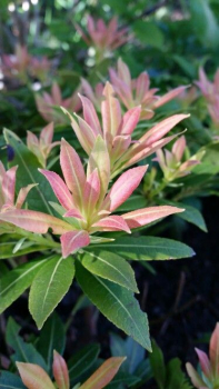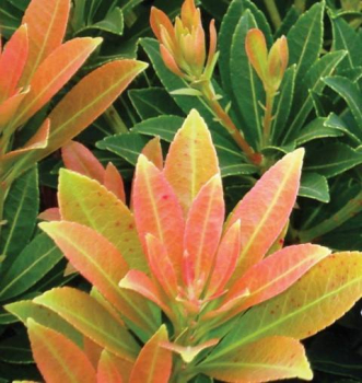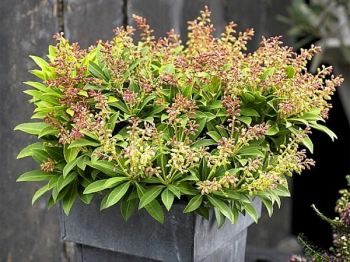 Nízka stálezelená odroda s atraktívnymi vínovo červenými výhonmi.
