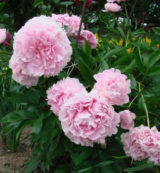 Bohato kvitnúci rododendron s ružovými kvetmi a úzkymi okrasnými listami.