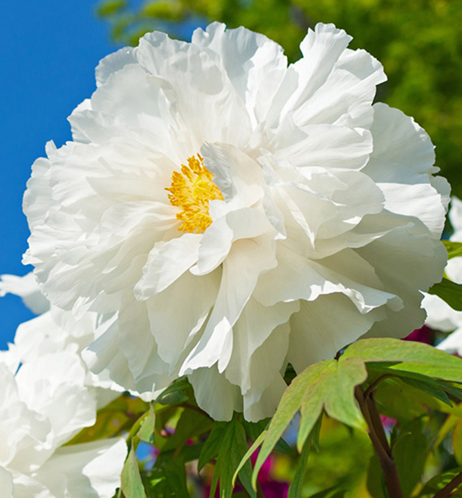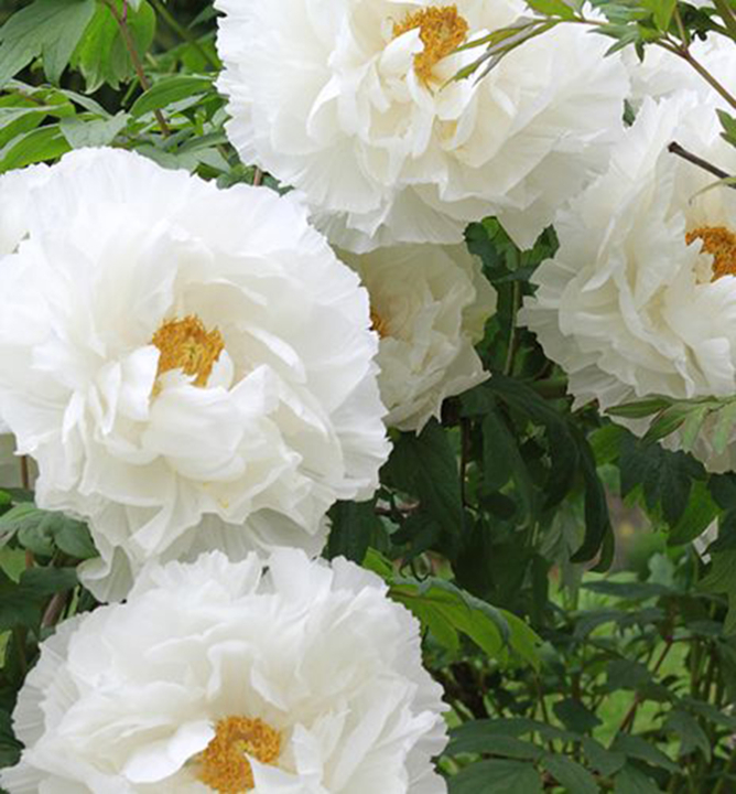 Charakteristika: Biela drevitá pivónia očarí množstvom kvetov pripomínajúcich ruže. Biele okvetné lístky sú jemne nariasené a obklopujú zlaté tyčinky. Voňavé kvety sa nesú na silných stonkách. Matné listy sú hlboko vykrajované, stredne zelené. Drevité japonské pivónie patria medzi najkrajšie kvitnúce dreviny, nazývajú sa aj ruže bez tŕňov. Sú to vrúbľované kry, ktoré majú v dospelosti výšku cca 1-1,5 m. Pivonky kvitnú od mája do júna veľkými kvetmi.