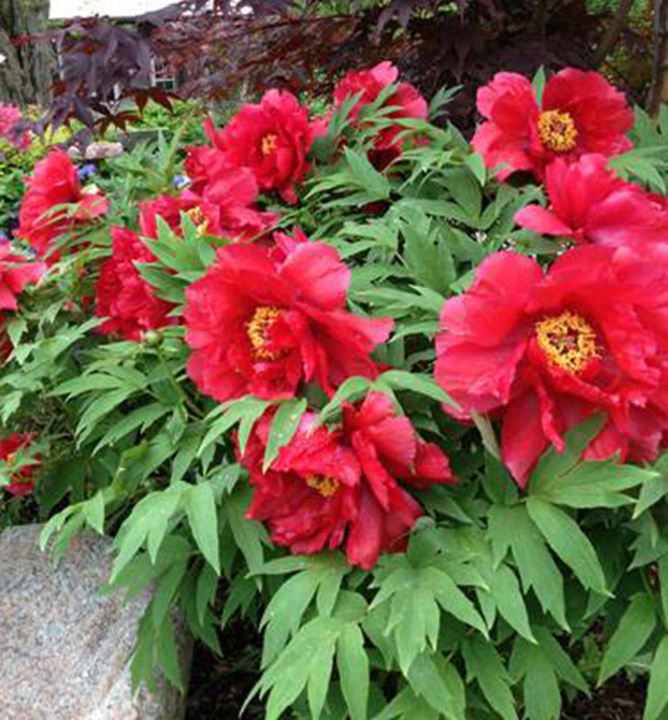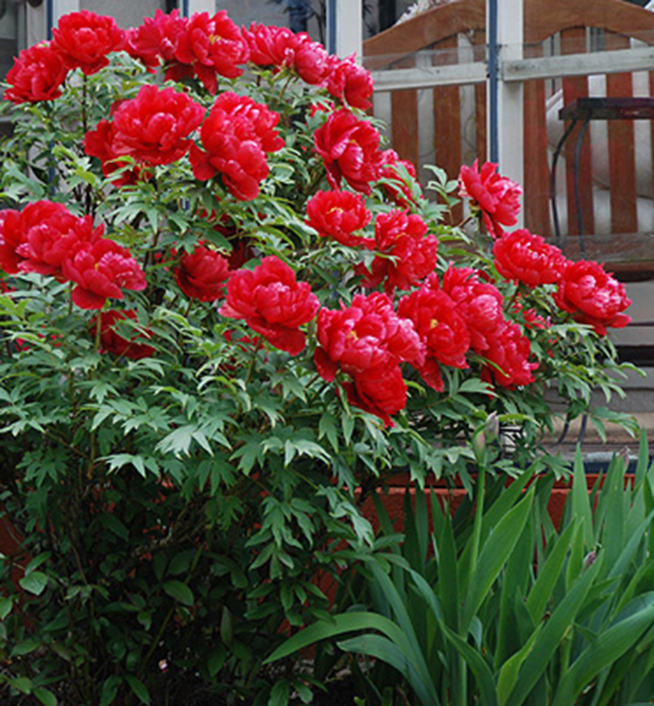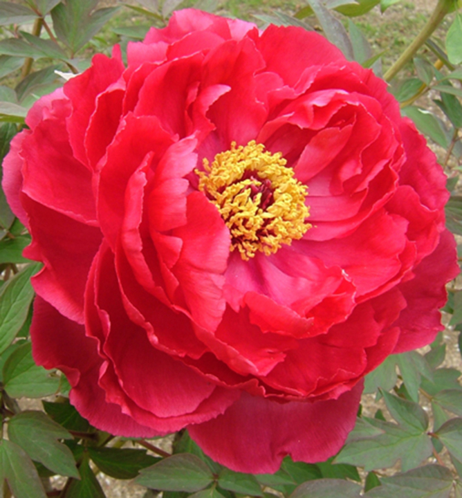 Impozantná veľkokvetá pivónia s výraznými červenými kvetmi.
