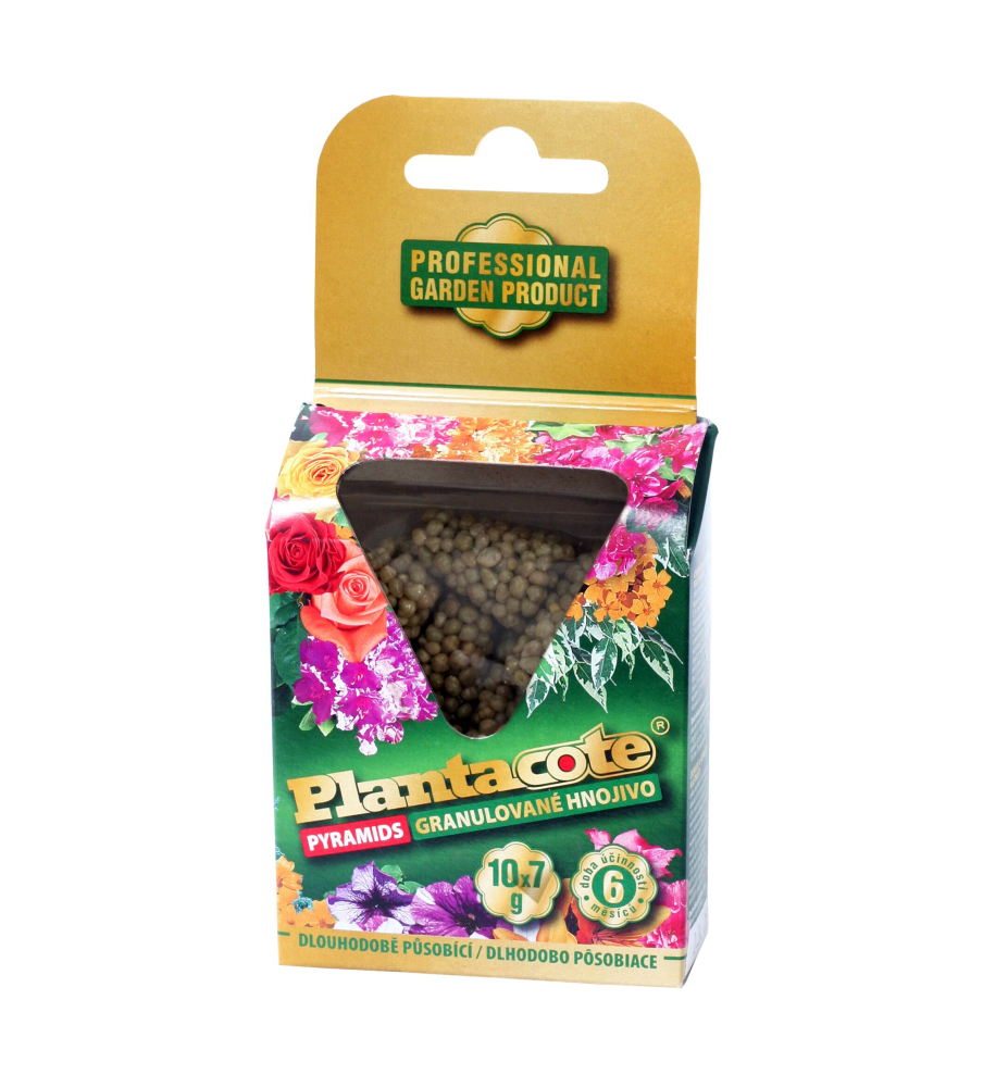 Charakteristika: Pyramídy PLANTACOTE je špeciálne hnojivo s regulovaným uvoľnovaním živín. Obsahuje dva komponenty - tzv. štartovací, ktorý uvoľňuje živiny ihneď po zapravení do pôdy a zásobný, ktorý začína živiny uvoľňovat po uplynutí 2 - 3 týždňov. Hnojivo je granulované a jeho granulky sú obalené elastickou priepustnou membránou. Plantacote zabezpečuje ošetreným kultúram rovnomerný prísun N, P, K, Mg a všetkých stopových prvkov.