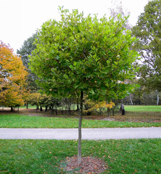 Okrasný strom s pravidelnou guľovitou korunou a zaujímavou kôrou.