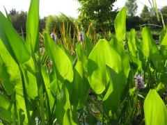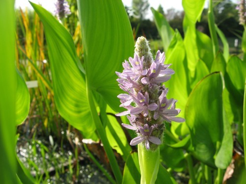 Nádherná bahenná rastlina so sýtomodrými klasmi kvetov a lesklými zelenými listami.