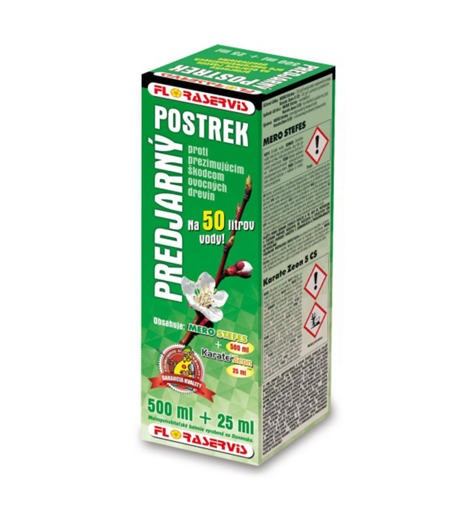 Charakteristika: Kombinácia prípravkov Mero Stefes a Karate Zeon 5 CS určená na predjarné ošetrenie ovocných a okrasných drevín (stromy, kríky ....) proti prezimujúcim škodcom. (napr. vošky, roztočec ovocný, méra jabloňová, štítničky, puklice, piadivky, kvetovky .....). Ničenie prezimujúcich škodcov je dôležitou súčasťou celoročnej ochrany ovocných a okrasných drevín, pretože škodcov zasiahneme v štádiu vajíčok alebo lariev, teda ešte skôr, než spôsobia väčšie škody. Insekticídna zložka ničí škodcov priamo ako dotykový a dýchací jed, olej zase vytvára na povrchu ošetrených drevín súvislý film, ktorý bráni vajíčkam a larvám v dýchaní a hynú. Čím je teplejšie, tým jednotlivé štádia škodcov intenzívnejšie dýchajú a o to výraznejšie sa prejaví ničivý účinok insekticídu s olejom. Preto by sa teplota pri predjarnom postreku mala pohybovať nad 15°C. Predjarný postrek má byť výdatný a dôkladný, preto by sme ho mali urobiť za bezvetria. Predjarným postrekom ničíme všetkých škodcov prezimujúcich na ovocných a okrasných drevinách. Sú to predovšetkým vošky, roztočec ovocný, roztoče a roztočce, štítničky, puklica slivková, puklice, méra jabloňová, piadivky a pod. Postrek robíme zásadne až po vypučaní, najskôr v štádiu myšieho uška, ale najneskôr tesne pred kvitnutím jednotlivých druhov drevín, pri jabloniach v štádiu ružových kvetných pukov. V oblastiach pravidelného výskytu kvetovky jabloňovej striekame v štádiu zelených kvetných pukov. Nezastupiteľné miesto má predjarný postrek v boji proti tým škodcom, ktorí sa zdržujú a škodia na kôre stromov (štítničky, puklica slivková), pretože sú zasiahnutelný iba na jar, keď sú stromy takmer bez lístkov.