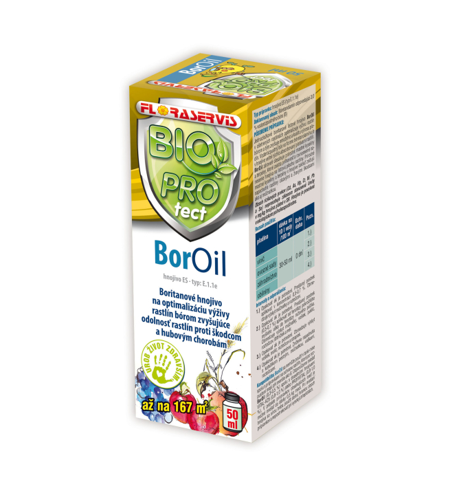 Charakteristika: BOROIL je boritanové hnojivo na optimalizáciu výživy rastlín bórom zvyšujúce odolnosť rastlín proti škodcom a hubovým chorobám. Náhrada za prípravok PREV B2, ale aj za predjarný postrek. Ekologické. Jednozložkové boritanové listové hnojivo BorOil v ošetrených rastlinách optimalizuje výživu rastlín bórom a tým zvyšuje množstvo a kvalitu výnosu plodín. Vodorozpustný bór vo forme bóretanolamínu v hnojive je veľmi rýchlo absorbovaný pletivami rastlín. Prírodné mastné kyseliny a terpény v hnojive zabránia napadnutiu rastliny cicavými a žravými škodcami ako aj múčnatkou.