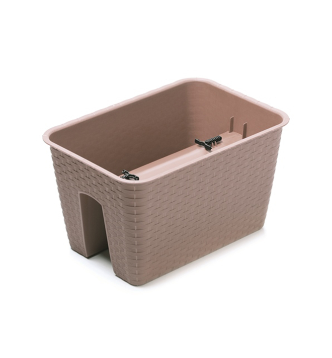 Charakteristika: Plastový ratanový truhlík so špeciálnou úpravou, ktorá umožní jednoduché zasunutie obalu na zábradlie balkónov a terasy a jeho upevnenie pomocou plastových vsuviek. V truhlíku nemusia byť kvety priamo vysadené, pretože má vďaka svojmu tvaru 2 a 4 priestory okrúhleho pôdorysu na vloženie kvetov v obaloch. Je vyrobený z kvalitného plastu, ktorý je odolný proti poveternostným vplyvom - stálofarebný, je pevný - pružný a odolný proti mechanickému poškodeniu.