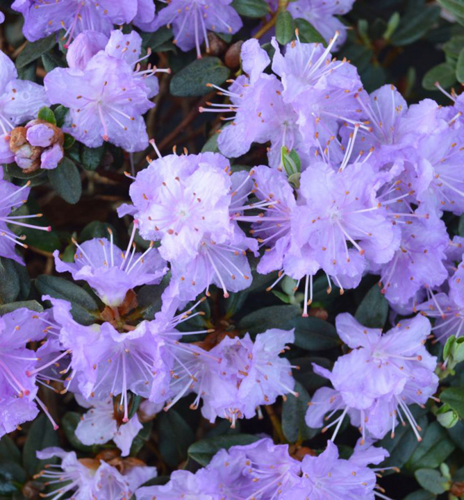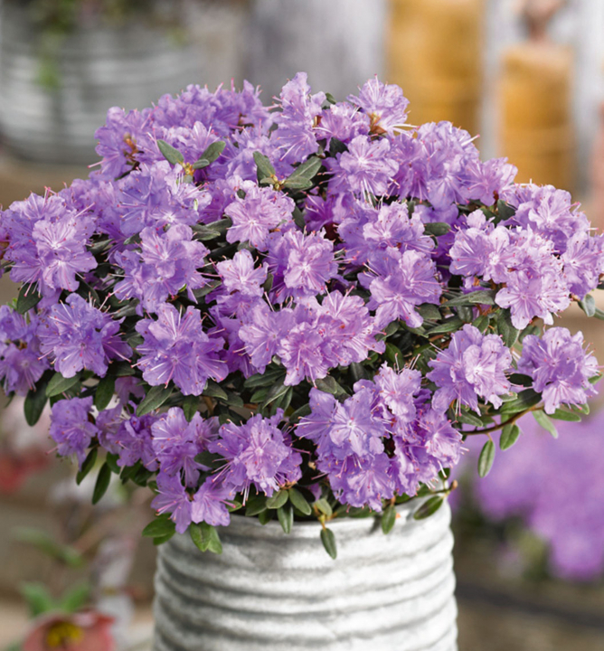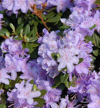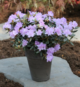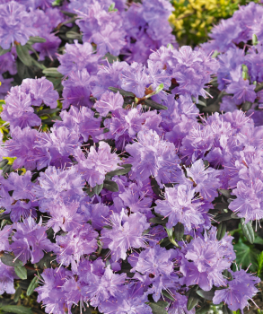 Obľúbený zakrslý rododendron s drobnými listami a množstvom fialových kvetov.