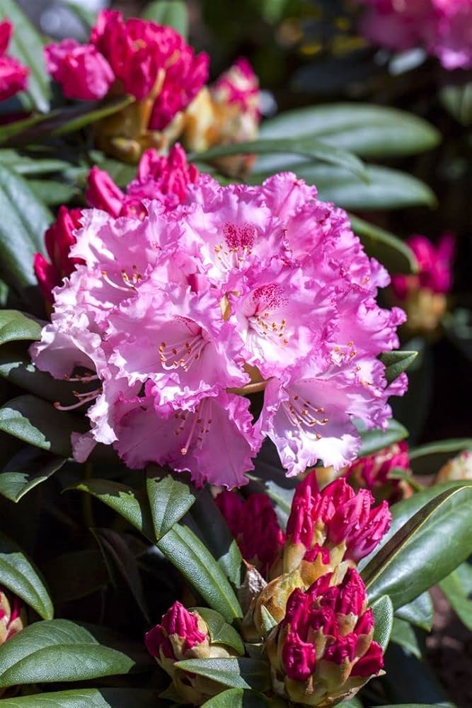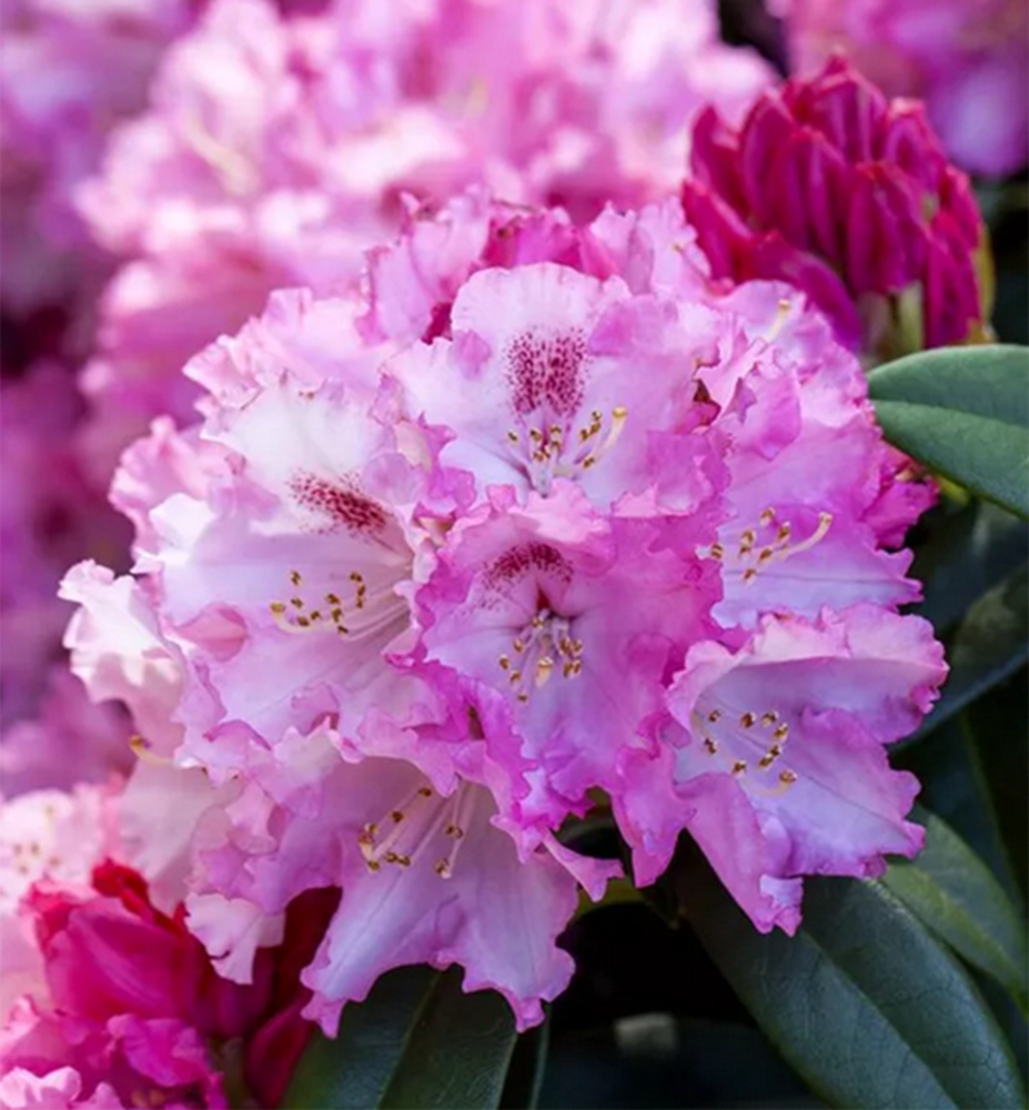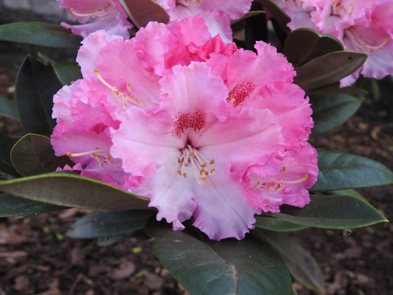 Nižší kompaktne rastúci rododendron s veľkými kvetmi v ružových odtieňoch.