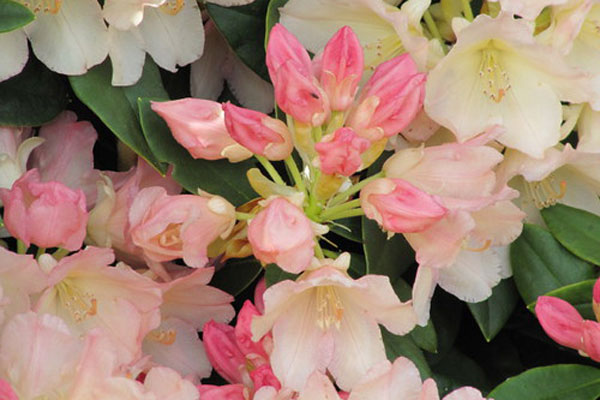 Nádherný bohato kvitnúci rododendron v jemných ružových a žltých odtieňoch.