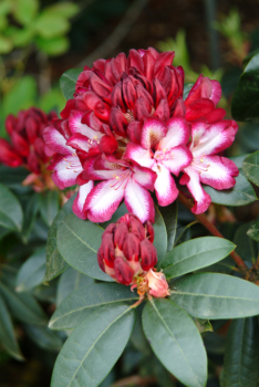 Nižšia odroda rododendronu s množstvom žiarivo červených kvetov.