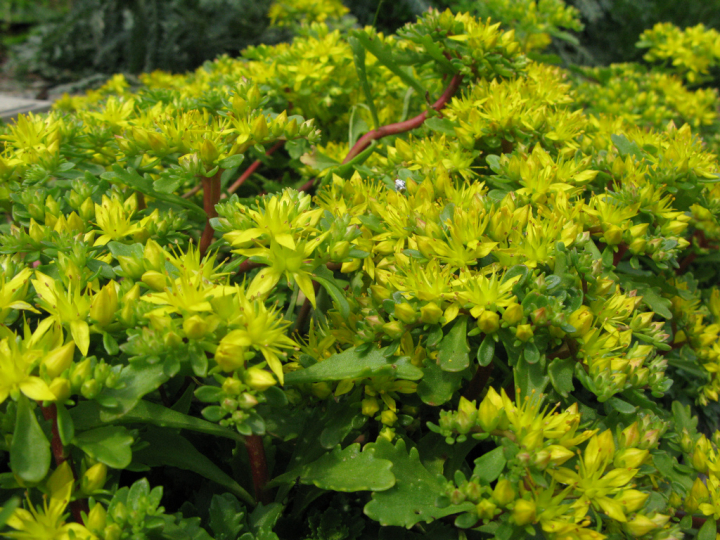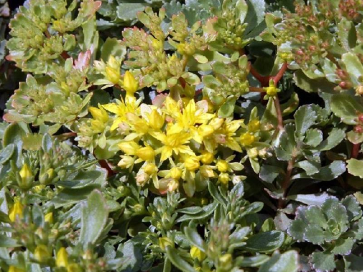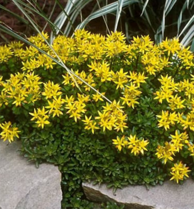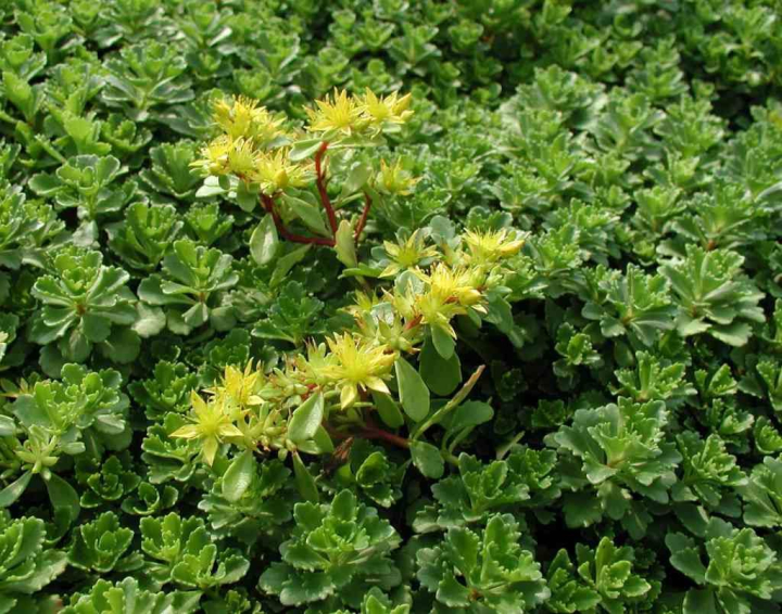 Nízky kobercovitý rozchodník s krásnymi hviezdicovitými kvetmi žltej farby.