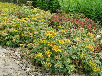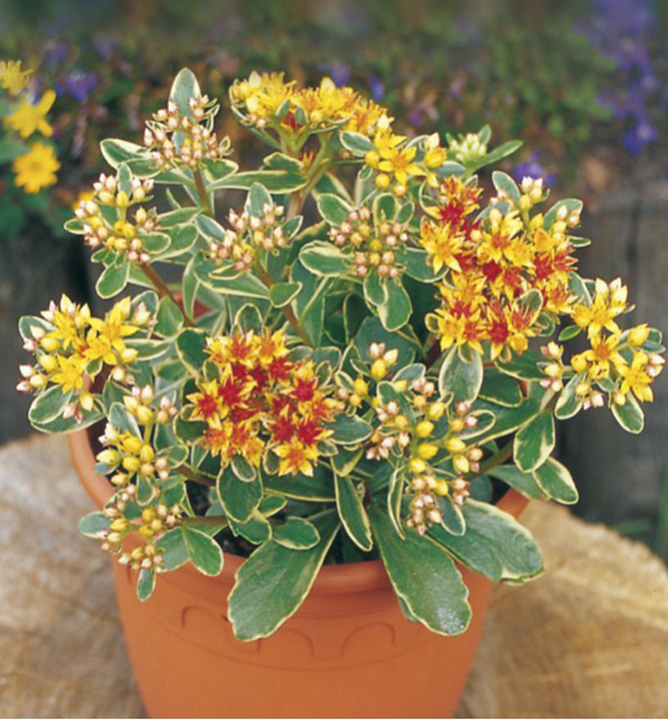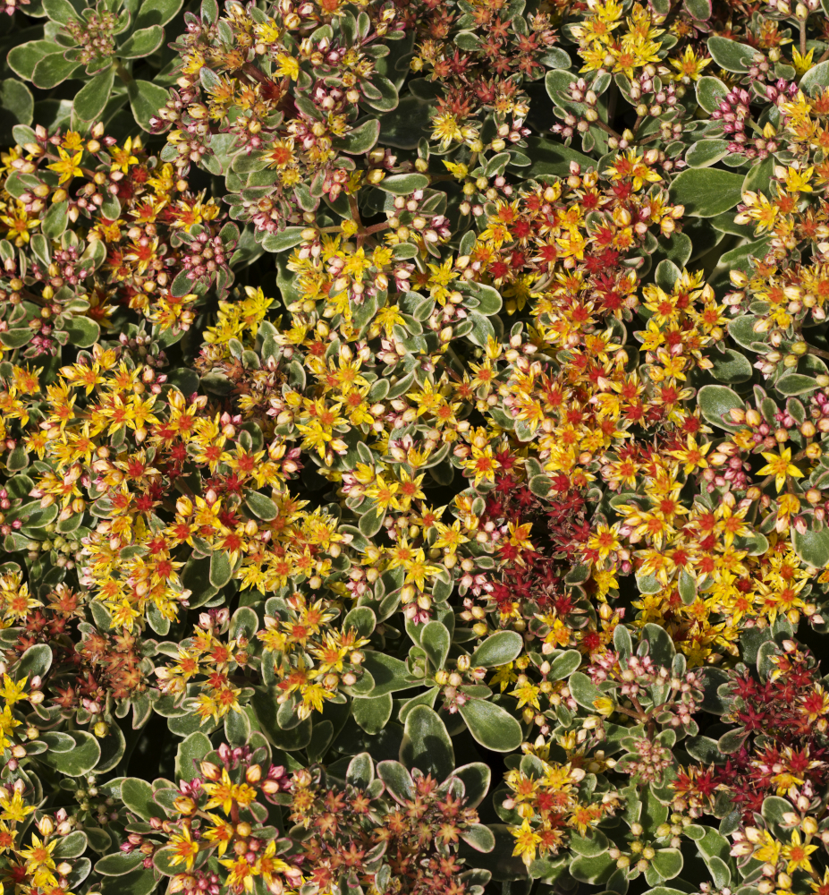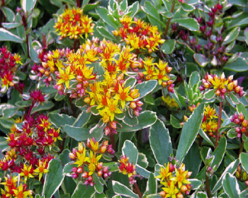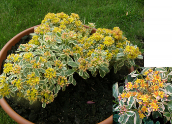 Charakteristika: Rozchodník ´VARIEGATUM´ je nízka skalnička, ktorá dorastá do výšky cca 10 -15 cm. Vyniká neprehliadnuteľnými žltými kvetmi, ktoré sa kontrastne sfarbujú do červena. Kvitne od júna do septembra. Dužinaté listy sú sviežej zelenej farby s krémovým lemovaním a počas celého roka pôsobia mimoriadne dekoratívne.