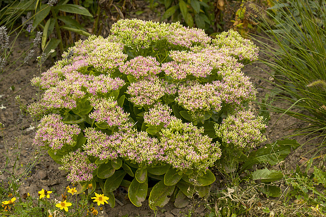 Nádherný ružovo kvitnúci rozchodník s limetkovo zelenými listami.