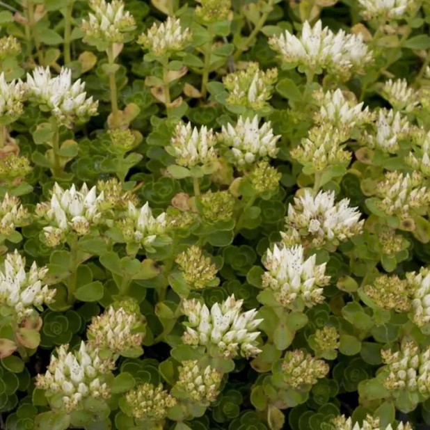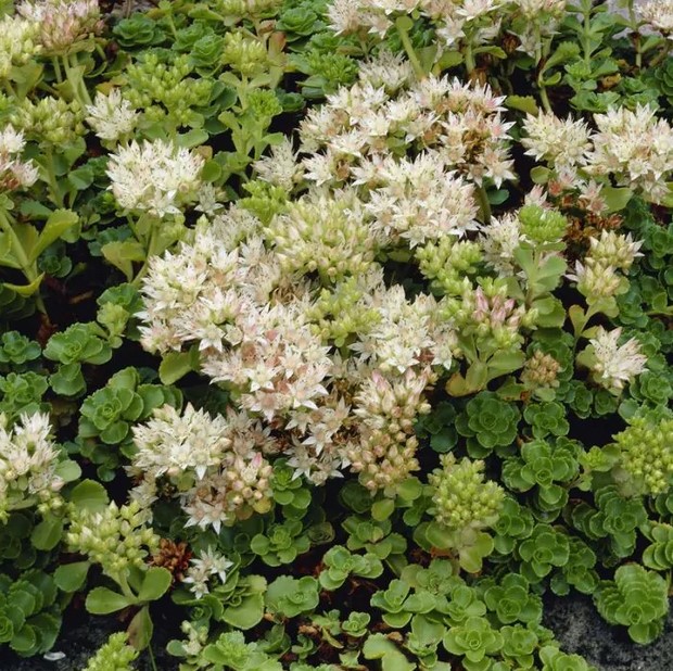 Nízky pôdopokryvný rozchodník tvoriaci husté vankúše sýtozelených listov.
