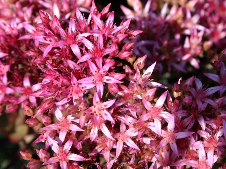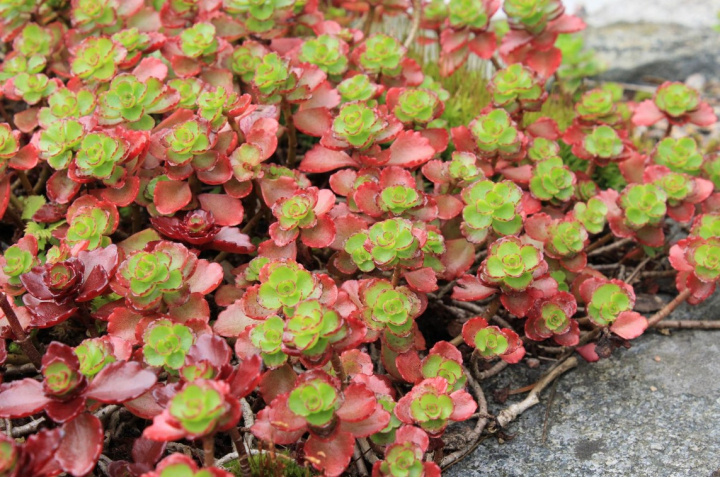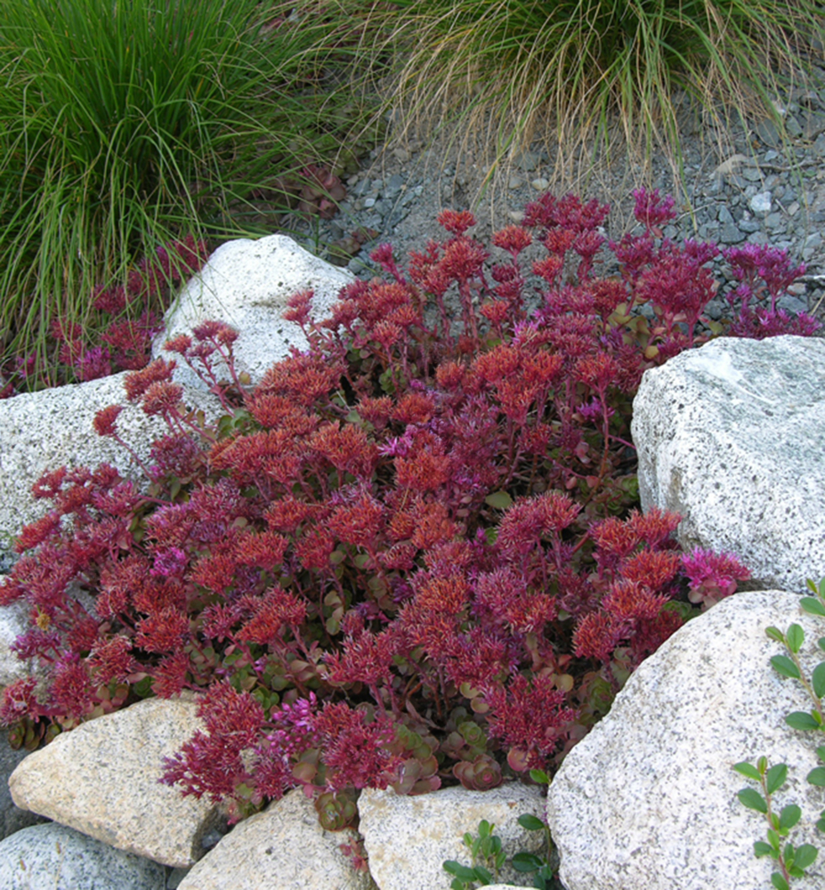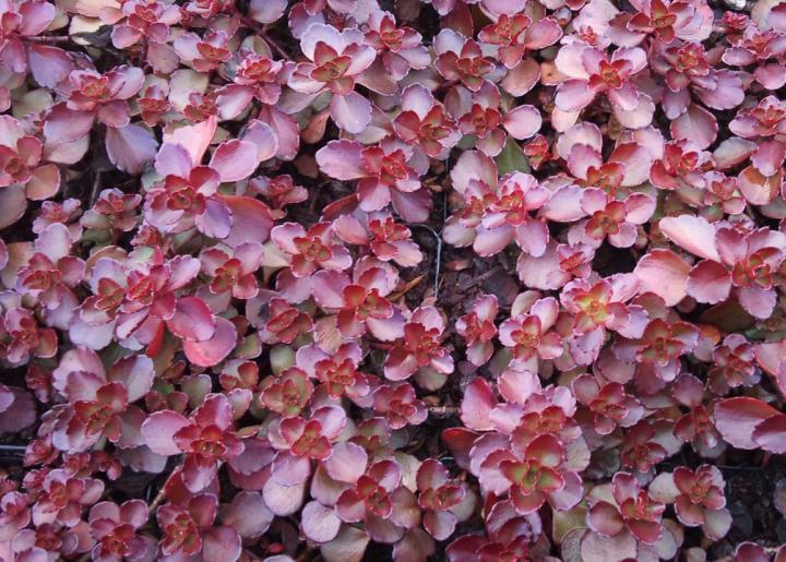 Obľúbený červenolistý kobercovitý rozchodník s ružovočervenými kvetmi.