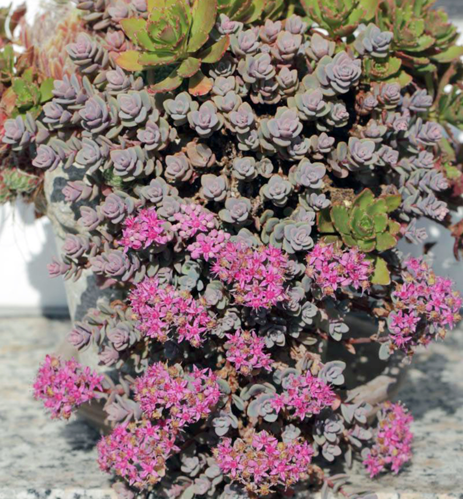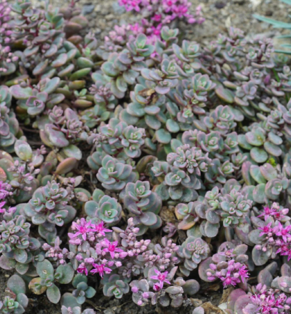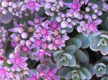 Bohato kvitnúci rozchodník s modrozelenými listami a rožovými kvetmi.