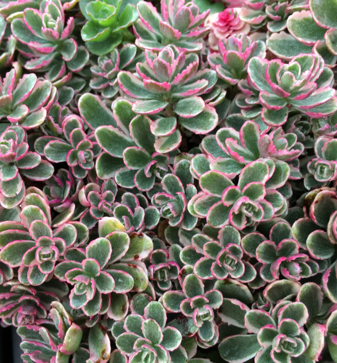Jedinečný rozchodník so zeleno bielymi dekoratívnymi listami a ružovými kvetmi.