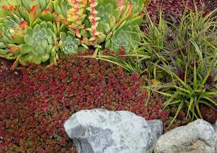 Pôdopokryvný rozchodník s meniacou sa farbou listov a bielymi kvetmi.