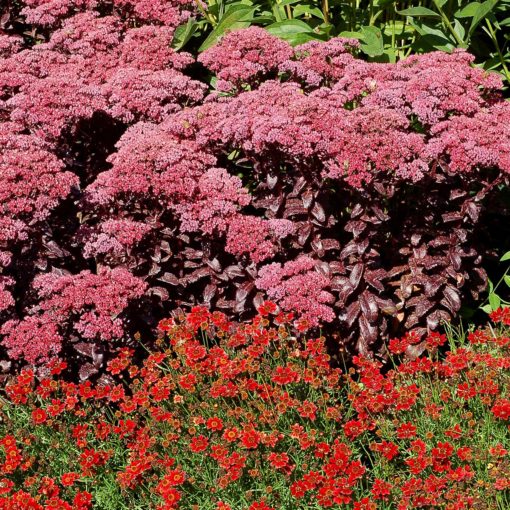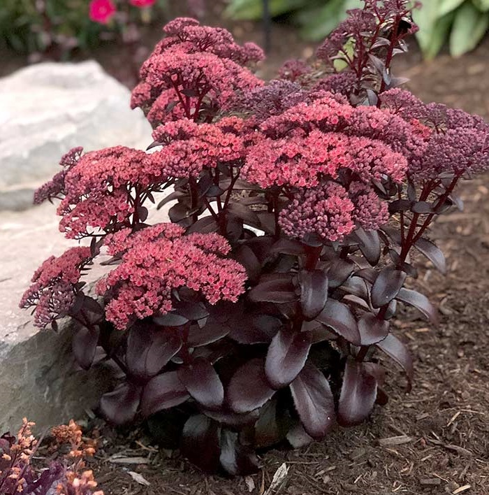Impozantný rozchodník s purpurovými listami a s ružovočervenými kvetmi.