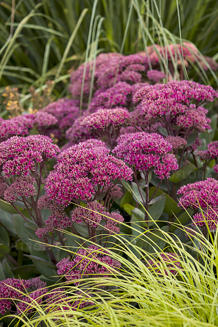 Pôsobivá jesenná trvalka s výraznými červenoružovými kvetmi a šedozelenými listami.