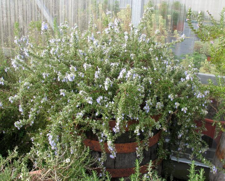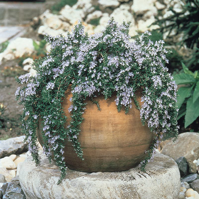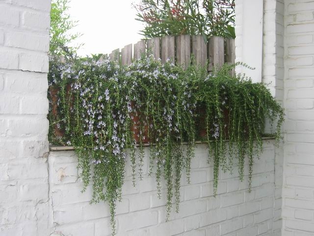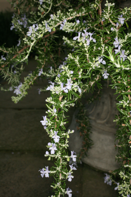 Úžasný previsnutý rozmarín s voňavými listami a bledomodrými kvetmi.