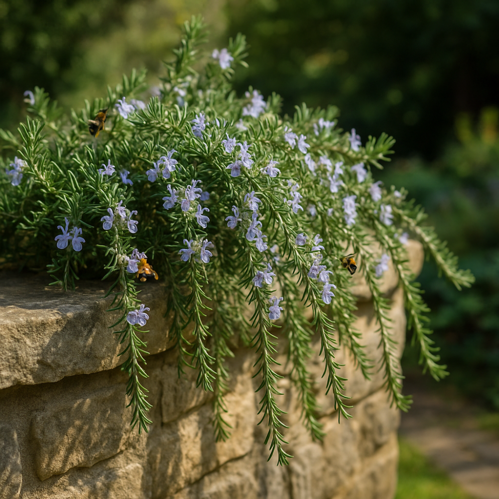 Charakteristika:Rozmarín "Modrý dážď" je vždyzelený ker s bohatým kaskádovitým rastom. Má sivozelené, ihlicovité , aromatické listy a svetlomodré kvety, ktoré kvitnú od jari až do jesene. Rozmarín sa v kuchyni používa najmä na dochutenie mäsa, rýb a zemiakov.